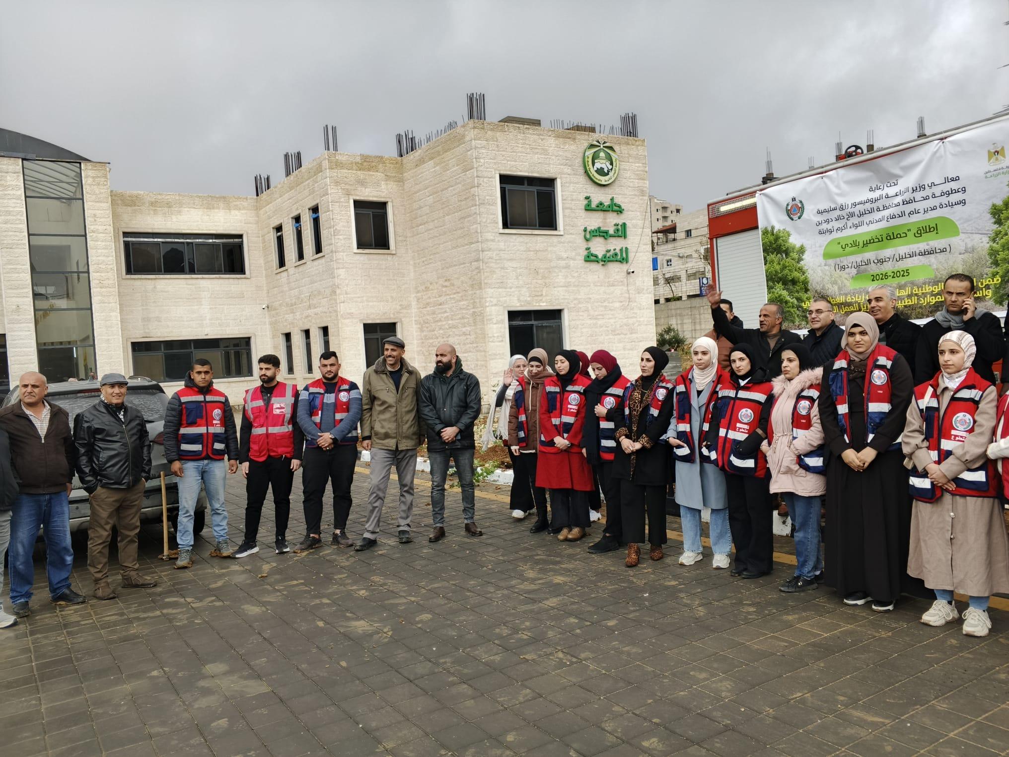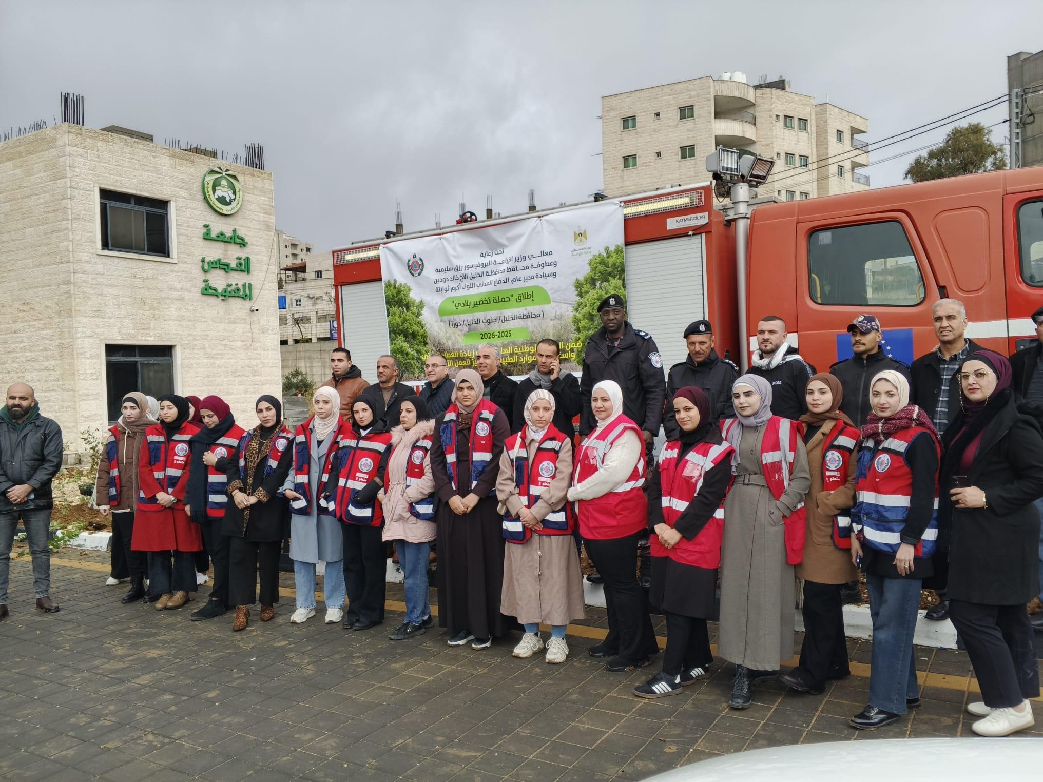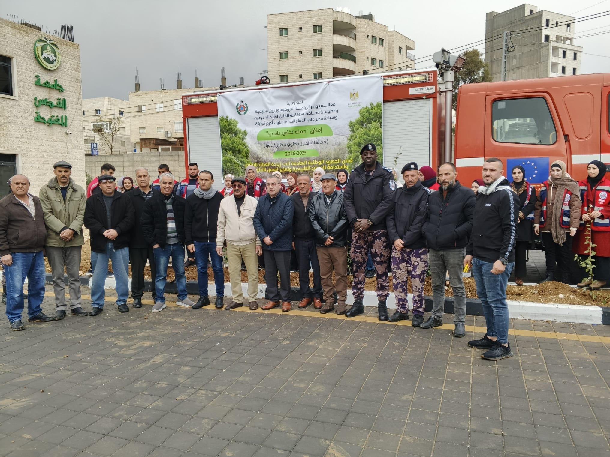 شارك فرع جامعة القدس المفتوحة في دورا، الأربعاء 2025/12/10، في فعاليات إطلاق الحملة الوطنية "تخضير بلادي"، التي تُنفَّذ تحت رعاية معالي وزير الزراعة أ. د. رزق سليمية، وعطوفة محافظ محافظة الخليل السيد خالد دودين، ومدير عام الدفاع المدني اللواء أكرم ثوابتة، بهدف تعزيز الرقعة الخضراء والحفاظ على البيئة والموارد الطبيعية في محافظات الوطن. وشهدت الفعالية حضورًا واسعًا من ممثلي المؤسسات الرسمية والأمنية والمجتمعية، إلى جانب مجلس اتحاد الطلبة وحركة الشبيبة الطلابية وطلبة متطوعين من الفرع.
