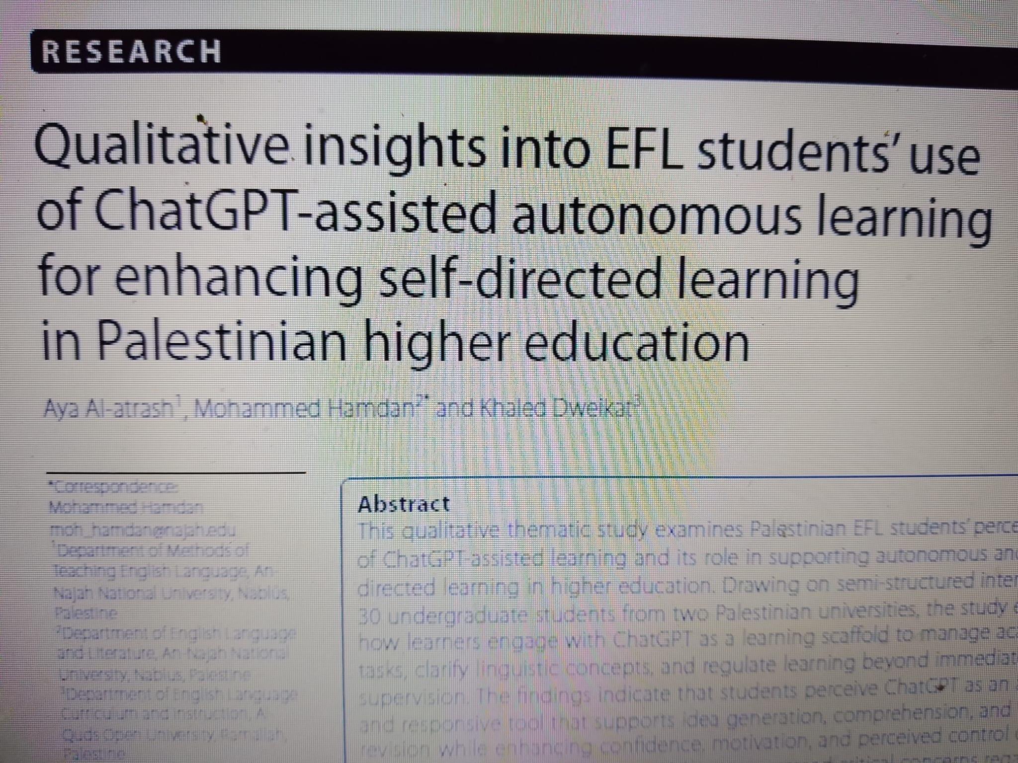 وهذا البحث مستل من رسالة الماجستير للباحثة آية الأطرش، حيث عرضت الدراسة نتائج بحث نوعي تناول تصورات طلبة اللغة الإنجليزية في الجامعات الفلسطينية حول استخدام تقنية ChatGPT في دعم التعلّم الذاتي وتعزيز مهارات التعلّم الموجّه ذاتيًا، مسلّطةً الضوء على الأبعاد التربوية والتطبيقية لتوظيف تقنيات الذكاء الاصطناعي في التعليم العالي.