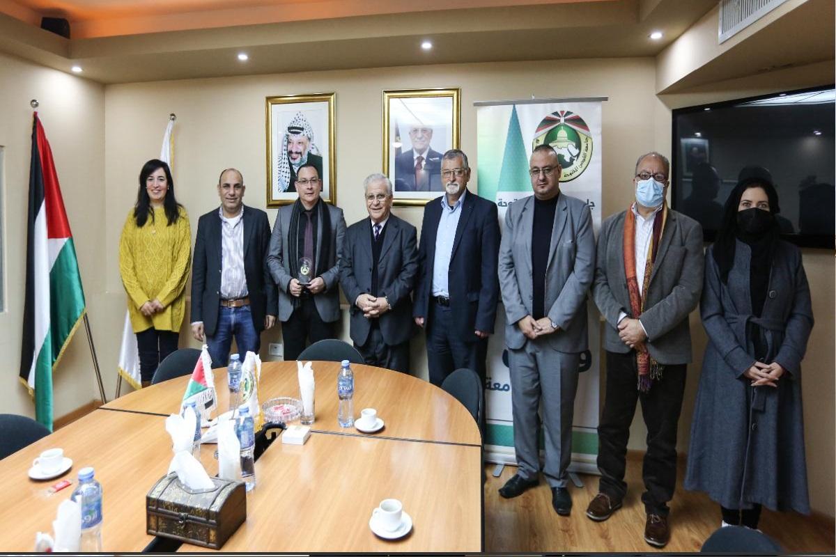 The meeting was attended by the Vice President for Academic Affairs, Prof. Samir Al-Najdi, the Assistant President for Public and International Relations and Media Affairs, Dr. Imad Hodli, The Assistant President for Follow-up Affairs Dr. Alaa Shakhshir, the Vice President of the University for Student Affairs, Dr. Iyad Shtayyeh, and Ms. Lina Abu Hilal, Head of the International Relations Division and  by  Member of The Union of Palestinian Communities in Latin America and the Caribbean (COBLAC) Mr. Jacob Salloum.