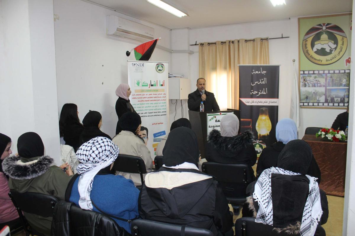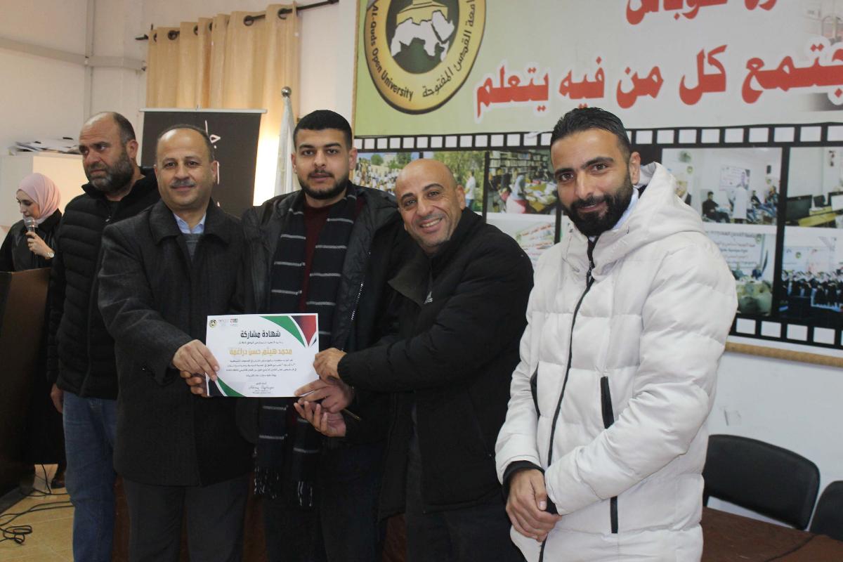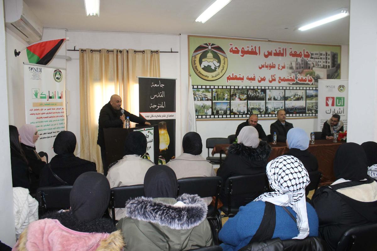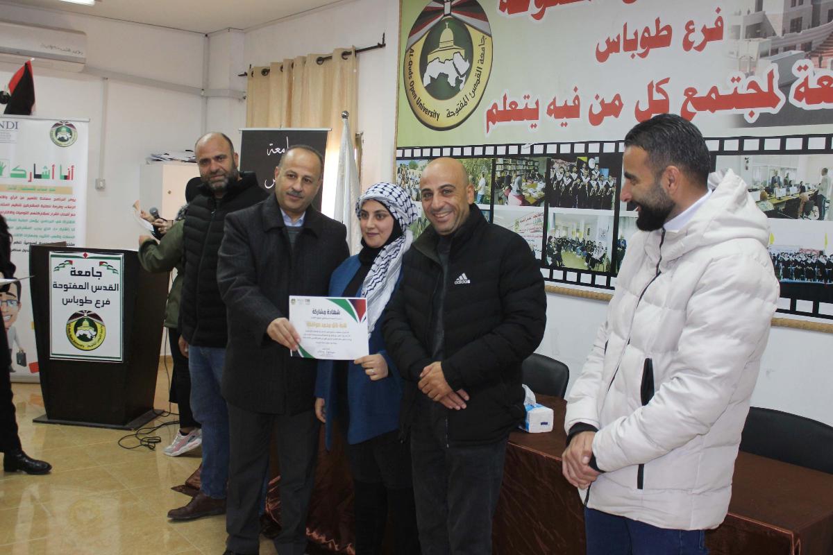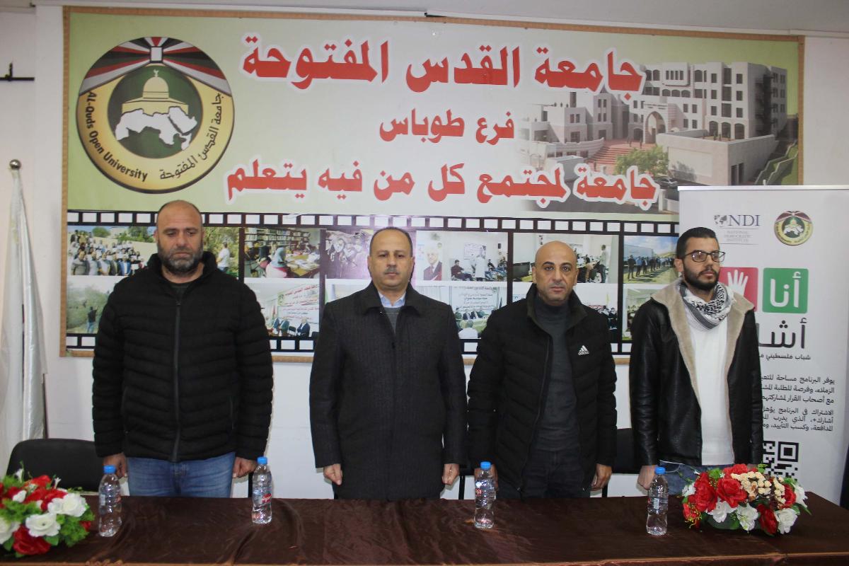 نظم فرع جامعة القدس المفتوحة في طوباس، والمعهد الديمقراطي الوطني NDI، حفلاً لتخريج طلبة برنامج "أنا أشارك"، وذلك بحضور مدير الفرع د. فخري دويكات، ومدير البرامج في المعهد الديمقراطي الوطني NDI أ. أشرف الزغير، ومساعد مدير البرامج أ. مصطفى طوبال، ورئيس قسم شؤون الطلبة أ. حيدر كايد، ومنسقة برنامج "أنا أشارك" في الفرع أ. آلاء دراغمة، ورئيس مجلس اتحاد الطلبة الأخ أيمن أبو العيلة.