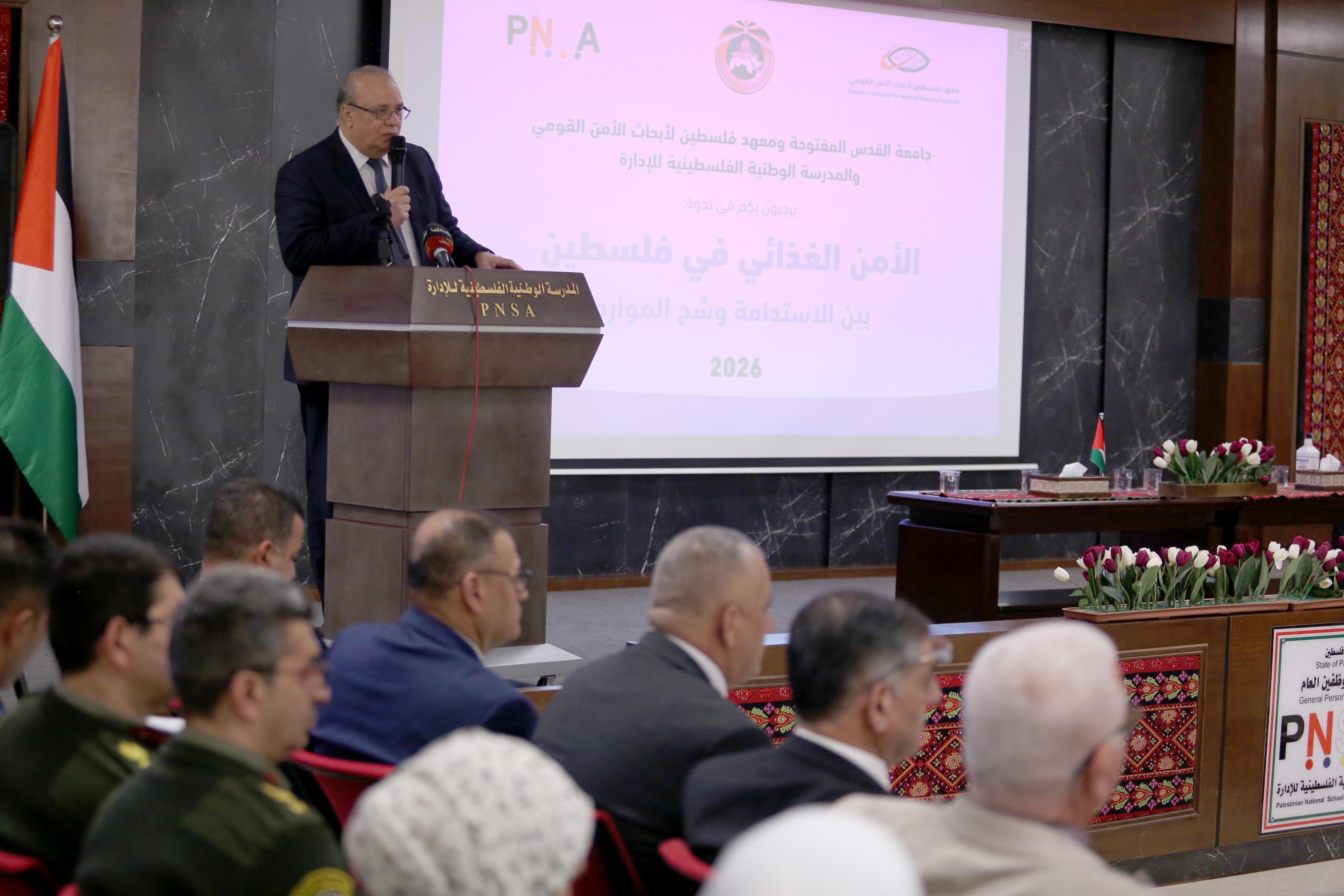 وقال رئيس مجلس إدارة المدرسة الوطنية الفلسطينية للإدارة، الوزير موسى أبو زيد، الذي أكد أن الأمن الغذائي ليس خياراً بل أولوية قصوى ويجب أن يكون على رأس أولويات أجندة الحكومة والقطاع الخاص. وأضاف أن فلسطين تواجه سياقاً وطنياً بالغ التعقيد، حيث تتقاطع الأزمات السياسية والاقتصادية والبيئية، ما يضع الأمن الغذائي في صدارة معادلة الصمود الوطني، مشيراً إلى أن الأمن الغذائي قضية أمن قومي بامتياز لأنها ترتبط مباشرة بالأرض والمياه والإنسان والقرار السيادي.