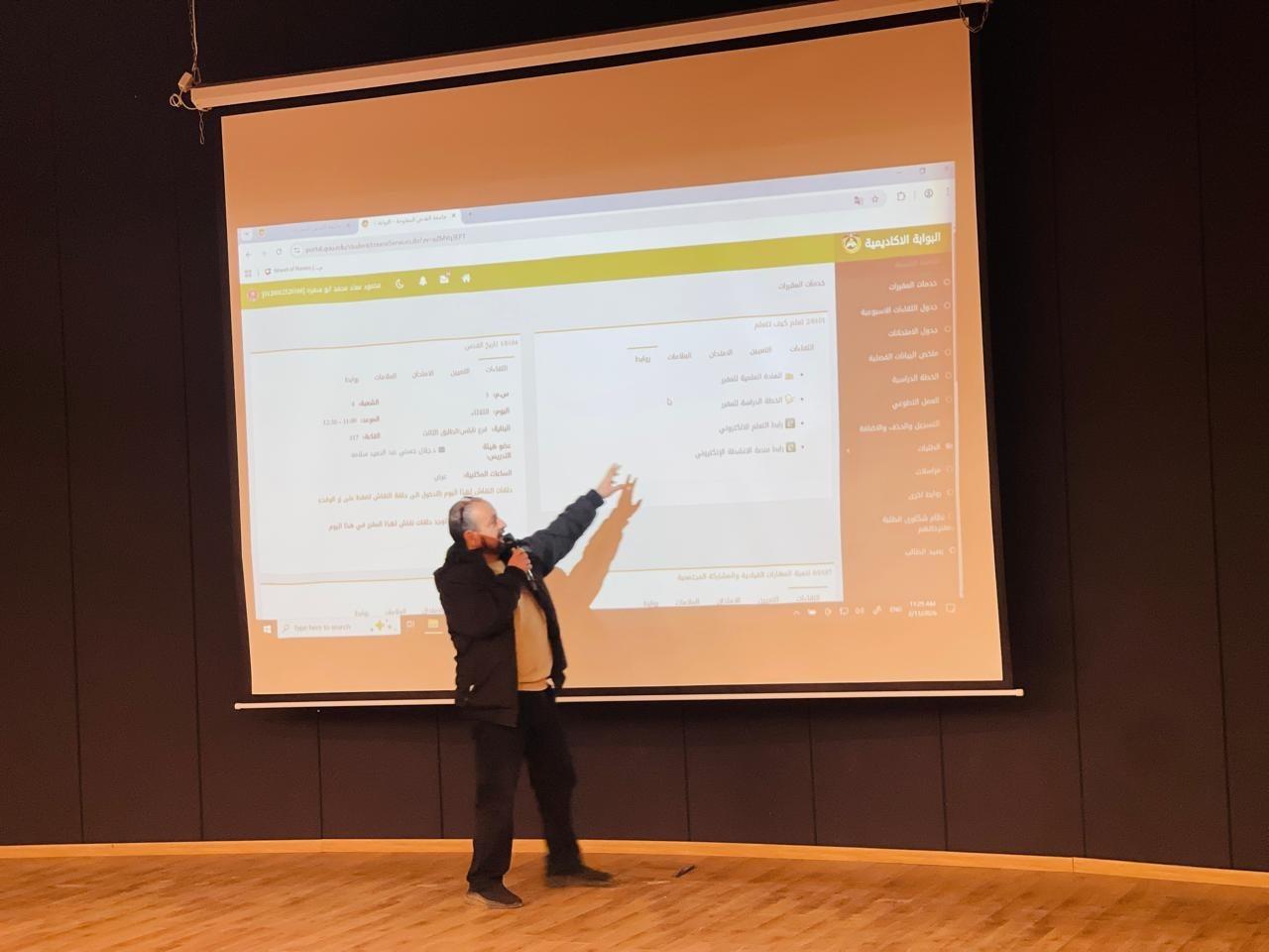 ورحب مدير فرع الجامعة أ. د. حسني عوض، بالطلبة الجدد والطلبة المسجلين في المساق، مؤكداً أن الجامعة تأسست "لتجسد إرادة الوطن وتطلعات شعبنا نحو مستقبل مشرق ولتكون منارة علمية تفتح أبوابها أمام الطلبة لتحقيق طموحاتهم وبناء قدراتهم العلمية والعملية".