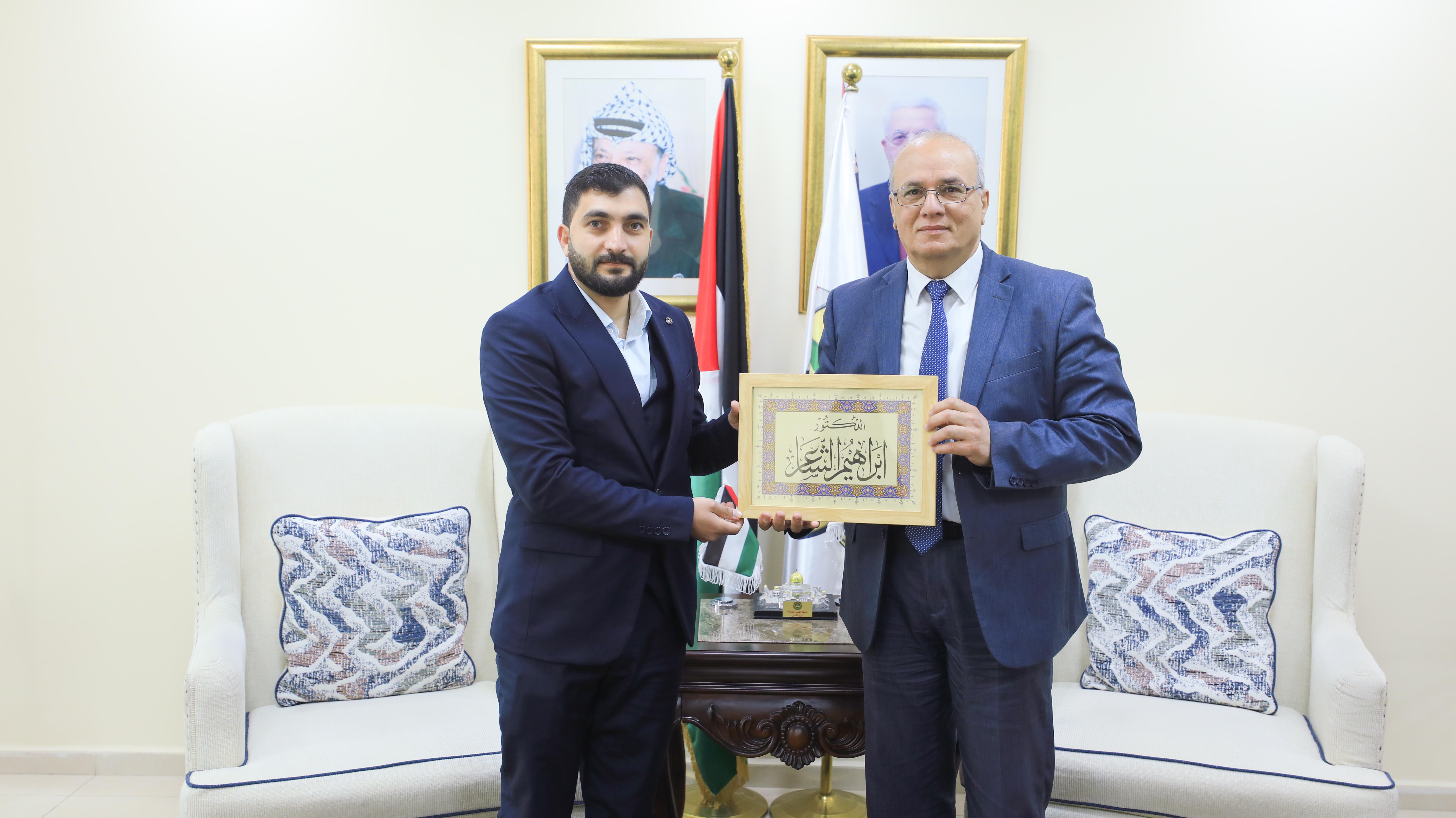 كرّم رئيس جامعة القدس المفتوحة أ. د. إبراهيم الشاعر، الطالب المتميّز بلال التميمي، تقديرًا لإنجازه النوعي وفوزه بالمركز الأول في مسابقة الخط العربي التي نظّمتها جامعة الدول العربية ضمن فعاليات "شهر اللغة العربية"، وذلك اليوم الأربعاء 25-2-2026 في مكتب رئاسة الجامعة بمحافظة رام الله والبيرة.
