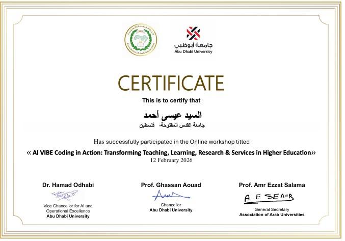 شاركت نخبة من أعضاء هيئة التدريس في كلية التكنولوجيا والعلوم التطبيقية ومركز تكنولوجيا المعلومات والاتصالات بجامعة القدس المفتوحة، في ورشة تدريبية متخصصة بعنوان: "إعادة ابتكار التعليم والخدمات الجامعية باستخدام VIBE Coding والذكاء الاصطناعي"، نظمتها جامعة أبو ظبي بالتعاون مع اتحاد الجامعات العربية، الخميس 2026/2/12م، عبر تقنية "زووم"، وذلك في إطار التزام الجامعة بالتميز الأكاديمي والتحول الرقمي.