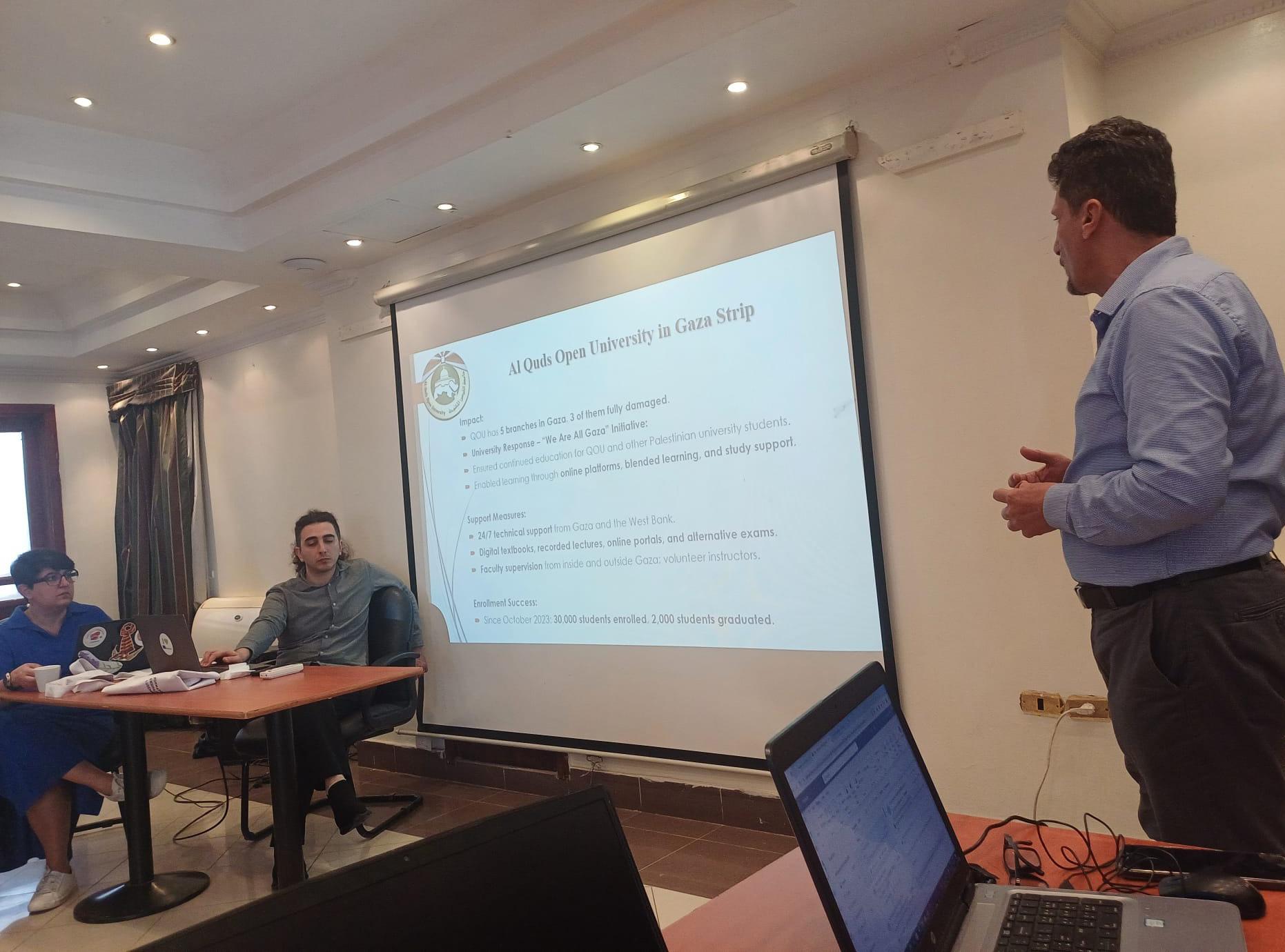 وتضمن برنامج الاجتماع تقديم عروض تعريفية قصيرة من قبل المؤسسات المشاركة، حيث قدّم د. حوامدة عرضاً تعريفياً عن جامعة القدس المفتوحة، استعرض فيه أبرز إنجازاتها وخبراتها في المشاريع الدولية. كما شارك الشركاء في جلسات نقاش حول تجارب التبادل الافتراضي ضمن مشروعي Virtual Mosaic وEcoCivic، حيث تحدثت أ. فرحانة عن أبرز التحديات التي واجهت تنفيذ المشروع، إلى جانب تبادل الخبرات حول النجاحات والدروس المستفادة.
