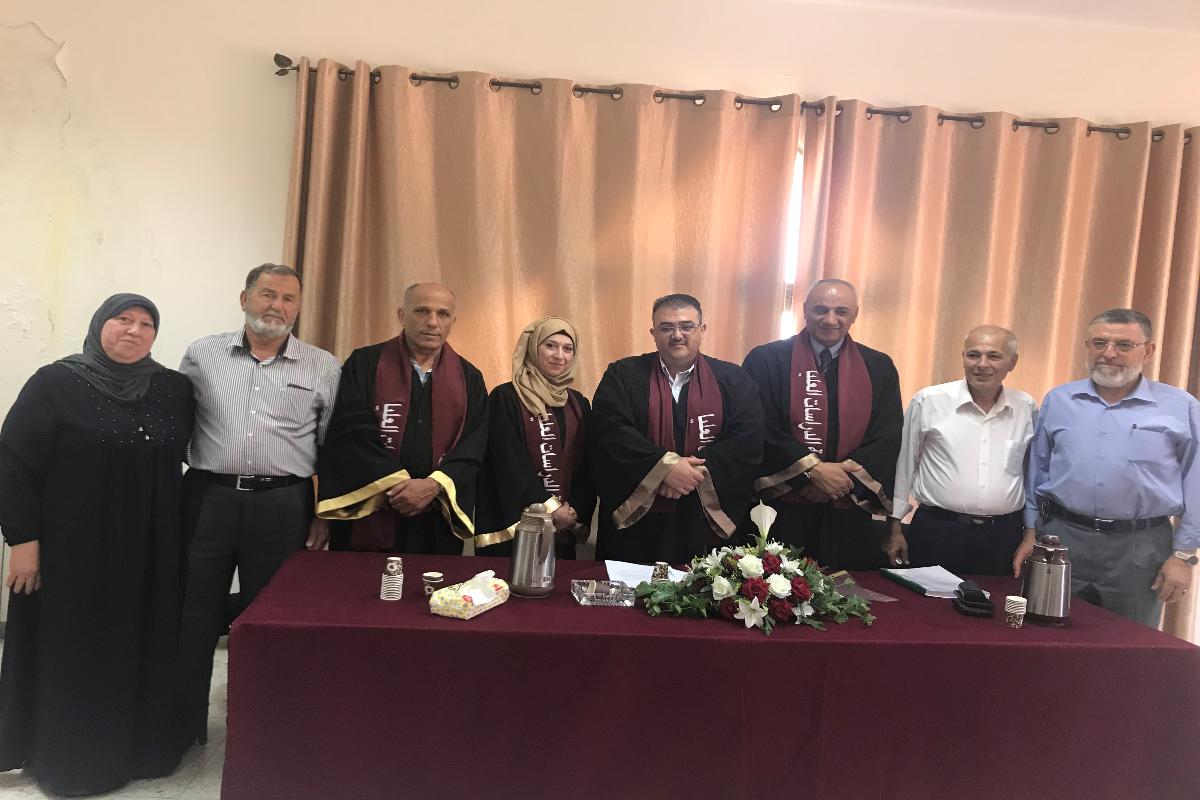 وتكونت لجنة المناقشة من: أ. د. محمد الطيطي مشرفاً ورئيساً، وأ. د. نبيل الجندي (جامعة الخليل) ممتحناً خارجياً، وأ. د. محمد أحمد شاهين ممتحناً داخلياً.