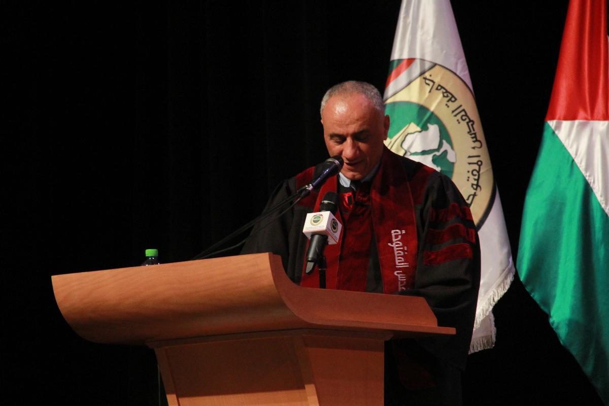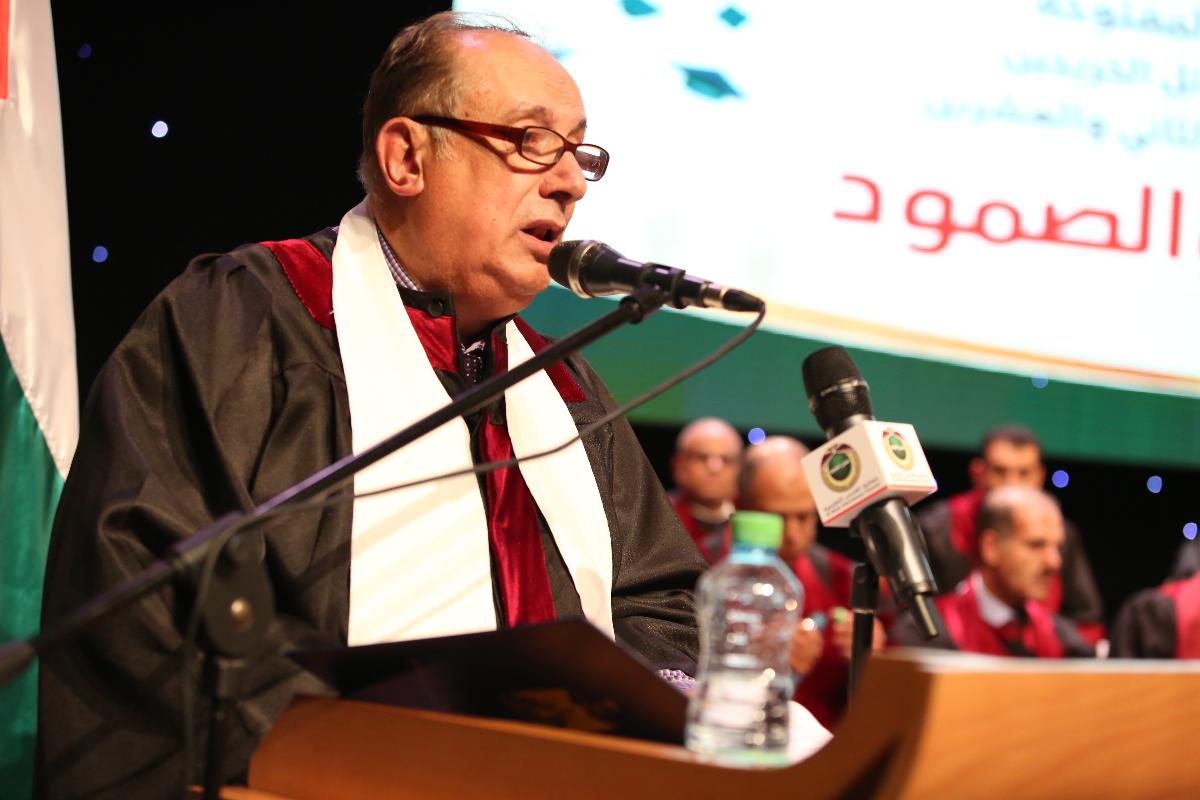 وأضاف: "إن التطور الذي شهدته الجامعة في المجالات كافة هو دليل على ما أحرزنا من نجاحات وإنجازات، يبرز فيها دور الفرد ويتعاظم فيها دور المؤسسة التي تحمل هم أبناء شعبنا المناضل لترسو بهم إلى شاطئ العلم والمعرفة، وتعزز لديهم الانتماء الوطني والاجتماعي، فدولتنا الفلسطينية وعاصمتها القدس الشريف جوهرة تبنى بعلم أبنائها وصمودهم وثباتهم".