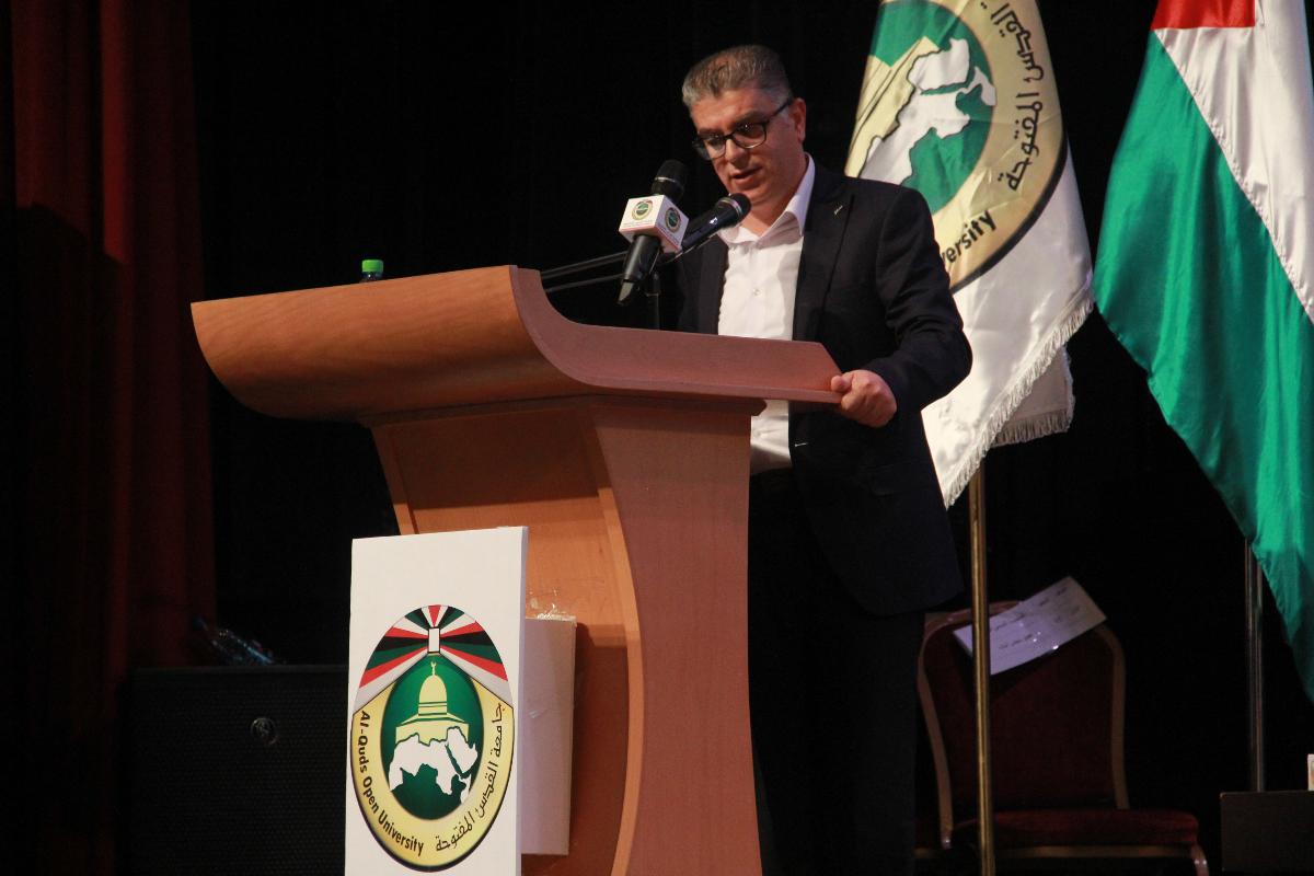 وتابع قائلا: "جامعة القدس المفتوحة، إنك جامعة في وطن ووطن في جامعة، فَهنيئاً لكِ برئيسك العالِم الإداري المخضرم، وهنيئاً لكِ بمدرسيكِ المميزين، هنيئاً لكِ بالعاملين ونقاباتهم، وبمجلس الطلبة، أمناء على المسيرة التعليمية وقادة الحركة الوطنية" .