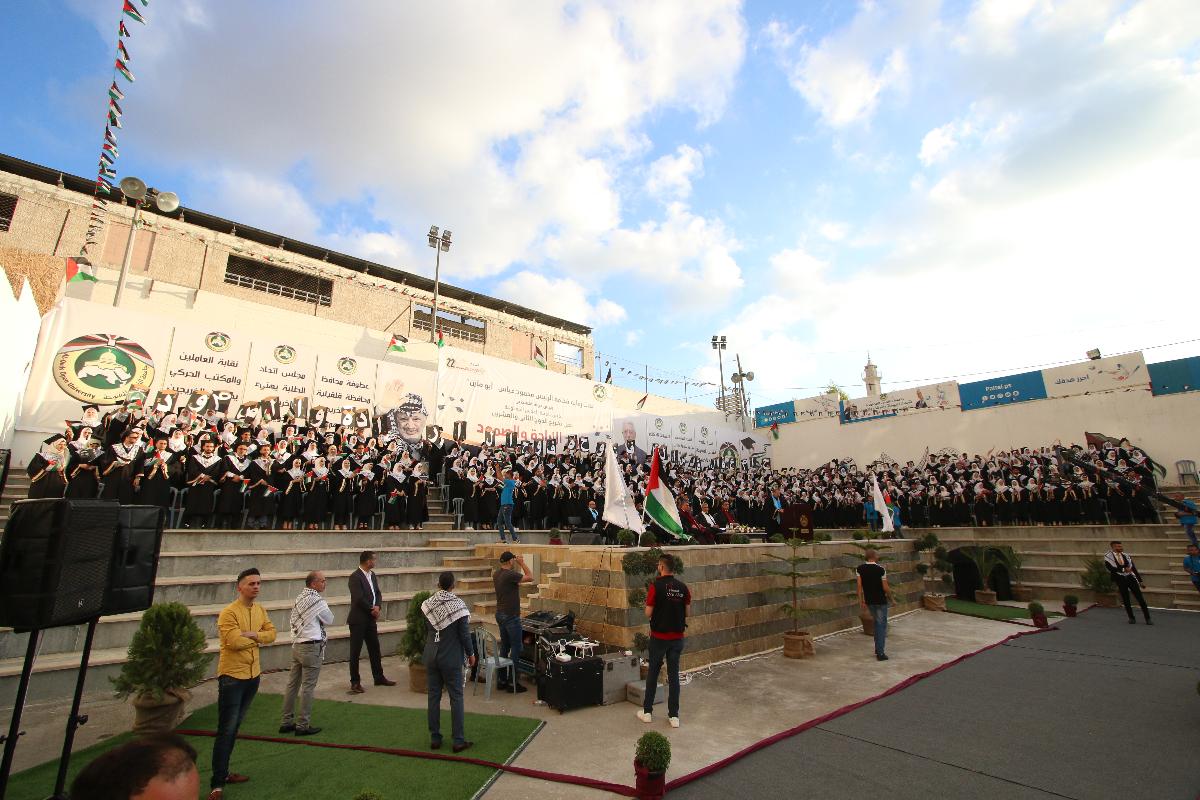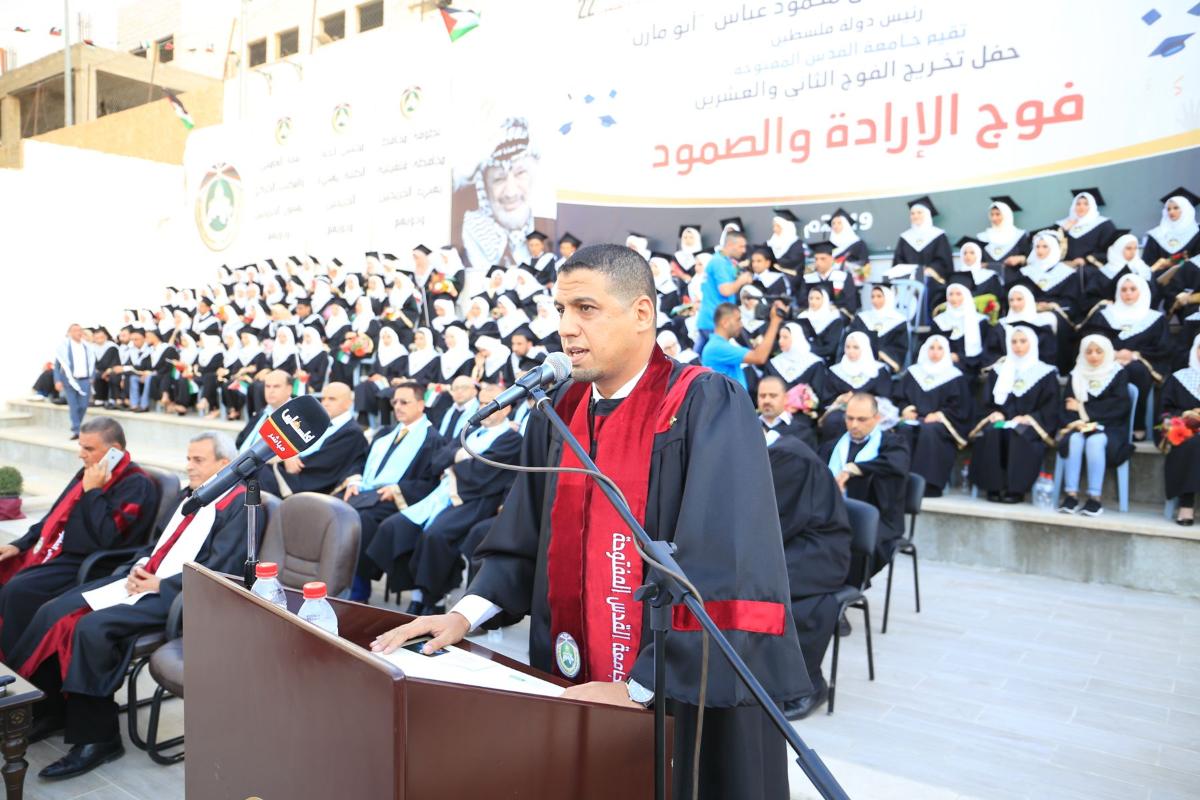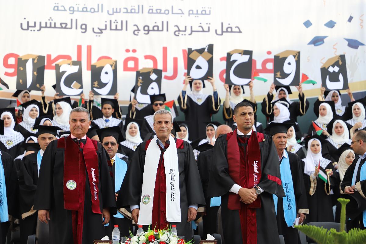 نظم فرع جامعة القدس المفتوحة في قلقيلية حفل تخريج الفوج الثاني والعشرين (فوج الإرادة والصمود)، يوم السبت الموافق 20/7/2019م، داخل الحرم الجامعي. وبدأ الاحتفال بآيات عطرة من القرآن الكريم، والوقوف تحية للسلام الوطني، فقراءة الفاتحة على أرواح الشهداء، بحضور ممثل فخامة السيد الرئيس محافظ محافظة قلقيلية اللواء رافع رواجبة، ومدير الفرع د. نور الأقرع، والهيئتين الإدارية والأكاديمية، ومديري وممثلي المؤسسات المدنية والأهلية والعسكرية، وشخصيات فاعلة، وممثلي فصائل العمل الوطني، وجمع غفير من أهالي الخريجين وطلبة الجامعة ومجلس الطلبة.