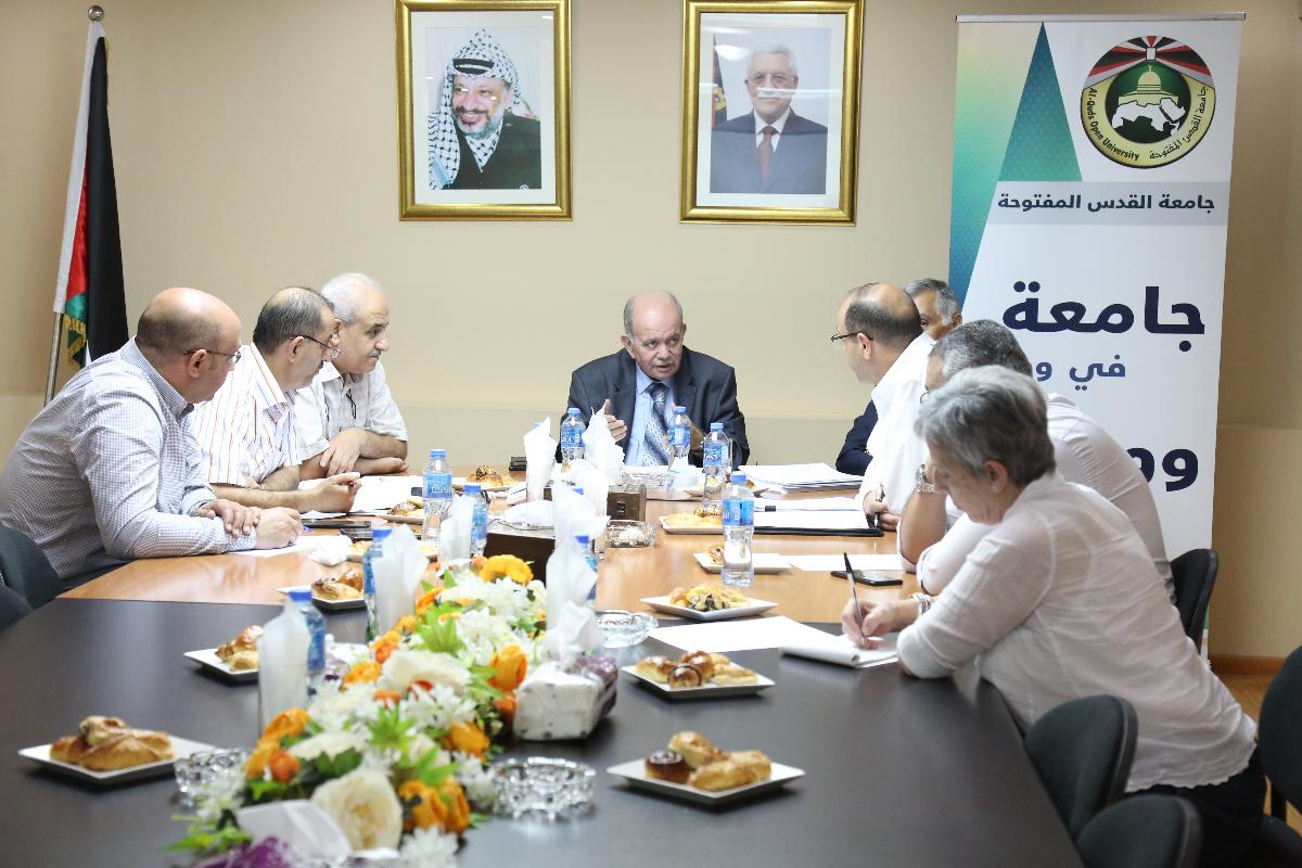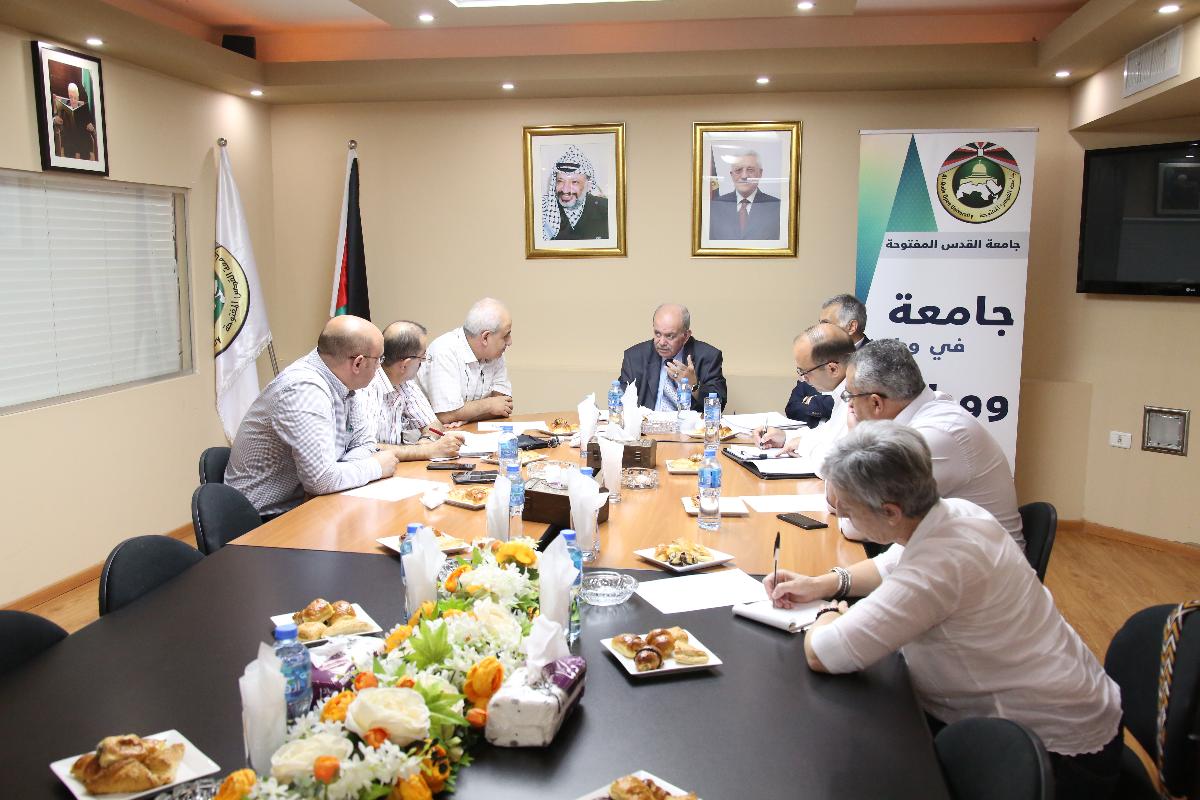 وترأس الاجتماع د. عصام خليل نائب رئيس "القدس المفتوحة" للشؤون المالية، فألقى كلمة رحب فيها بالضيوف باسم رئيس الجامعة أ. د. يونس عمرو، ناقلاً لهم تمنياته بالتوفيق والنجاح.