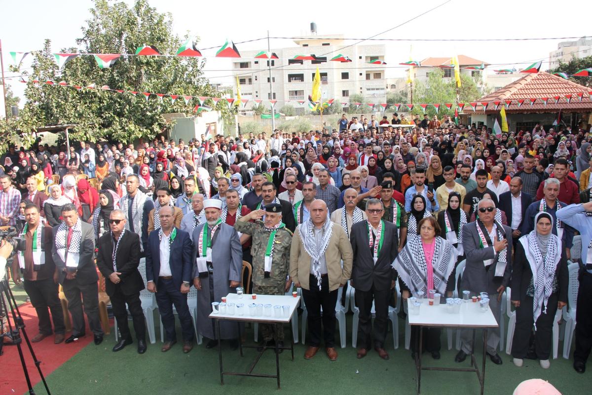 بدأ الاحتفال بتلاوة عطرة من آيات الذكر الحكيم، تلاها السلام الوطني الفلسطيني وقراءة الفاتحة على روح الشهيد (أبو عمار)، وشهداء الثورة الفلسطينية.