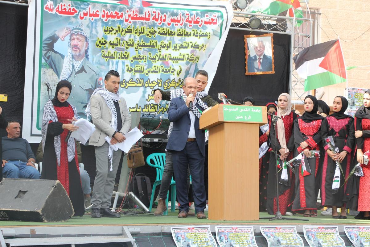 نظم مجلس اتحاد الطلبة وحركة الشبيبة الطلابية في فرع جنين، يوم الأربعاء الموافق 13/11/2019 حفل إحياء ذكرى استشهاد الرئيس الراحل ياسر عرفات " أبو عمار"، وذلك في ساحة الجامعة، بحضور عطوفة محافظ محافظة جنين اللواء أكرم الرجوب، ووزيرة الصحة د. مي الكيلة، وأمين المجلس الثوري لحركة فتح السيد ماجد الفتياني، وأعضاء المجلس الثوري، وإقليم حركة فتح في محافظة جنين، وقيادة الأجهزة الأمنية، وممثلي المؤسسات الرسمية والأهلية، وعدد من موظفي الجامعة وطلبتها.