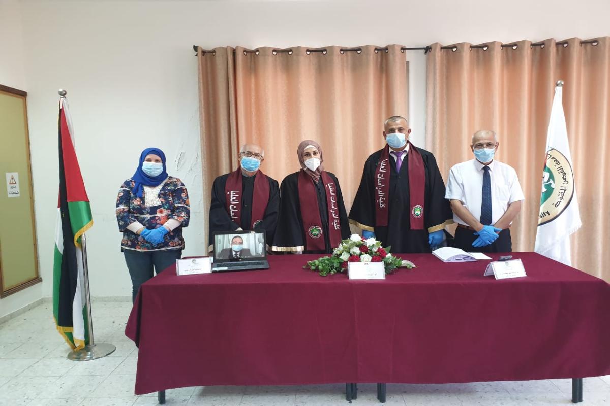 ناقشت عمادة الدراسات العليا والبحث العلمي في جامعة القدس المفتوحة، رسالة الماجستير التي قدمتها الطالبة مريم محمد سليم زغلول في برنامج ماجستير اللغة العربية وآدابها، والموسومة بـ "السيميائية في التراث العربي"، وذلك في قاعة الاجتماعات بمبنى الدراسات العليا برام الله، وذلك يوم السبت 27/6/2020م، عبر تقنية "الفيديوكونفرنس" بمكتب نائب الرئيس لشؤون قطاع غزة، للتواصل مع الممتحن الداخلي، وبحضور عميد الدراسات العليا والبحث العلمي أ. د. حسني عوض، ورئيس لجنة برنامج ماجستير اللغة العربية وآدابها أ. د. عبد الرؤوف خريوش، ومساعدة العميد أ. صباح عرقوب.