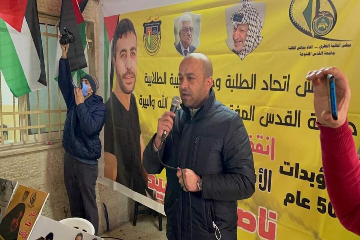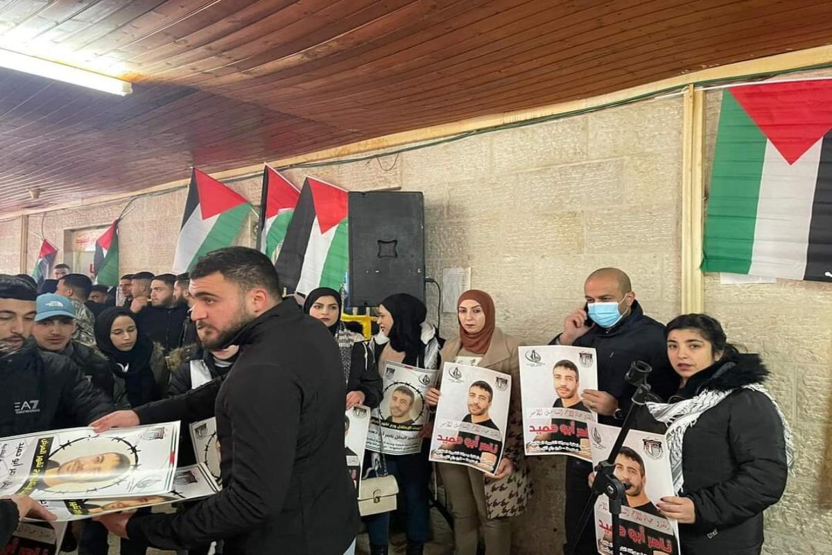 نظم فرع الجامعة برام الله والبيرة ومجلس اتحاد الطلبة وحركة الشبيبة الطلابية، السبت 15/1/2022 في حرم الجامعة، وقفة تضامنية مع الأسير البطل في سجون الاحتلال ناصر أبو حميد، الذي يخوض معركة الكرامة جراء الإهمال الطبي المتعمد الذي تقوم به سلطات الاحتلال الإسرائيلي بحرمانه من نيل الحرية والعلاج بين أحضان شعبه، حيث افتتح الوقفة د. حسين حمايل مدير الفرع ممثلاً عن إدارة الجامعة، ناقلاً تحيات رئيس الجامعة أ. د. سمير النجدي، معرباً عن دعمه وتضامنه مع الأسرى في سجون البطش والاحتلال، موضحاً أن القيادة الفلسطينية مهتمة اهتماماً بالغاً بموضوع الأسرى في السجون، وعلى رأسهم الأسير المريض ناصر أبو حميد، داعياً إلى التضامن مع الأسير وعمل زيارة لخيمة التضامن دعماً وإسناداً لهذا البطل.