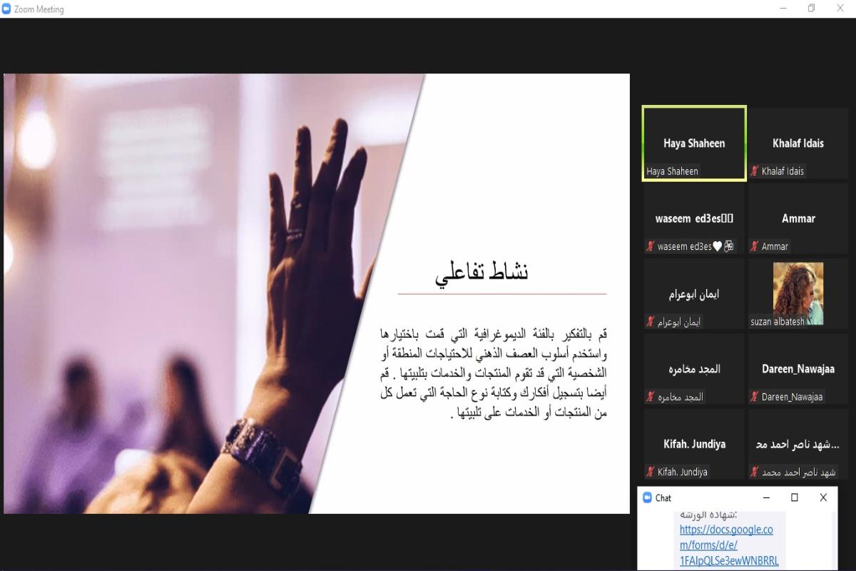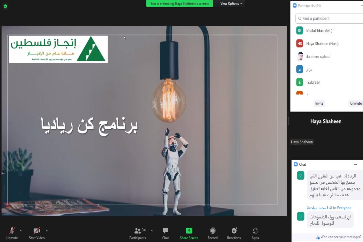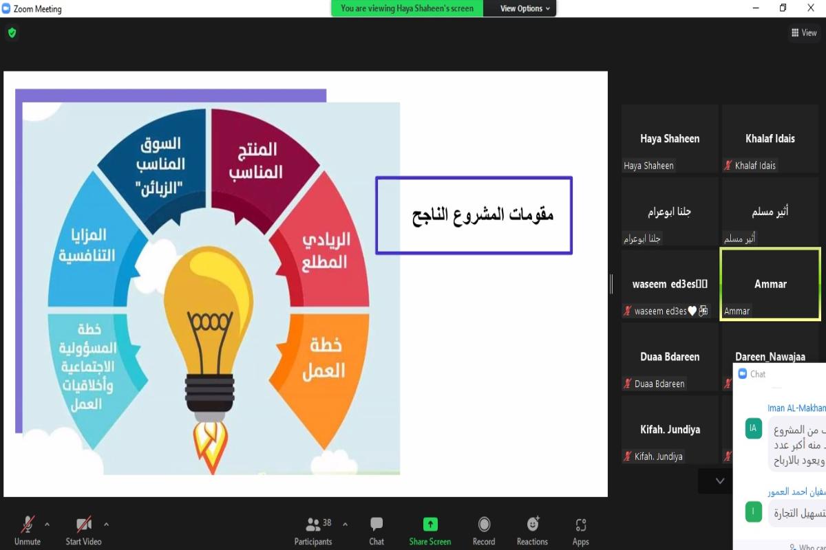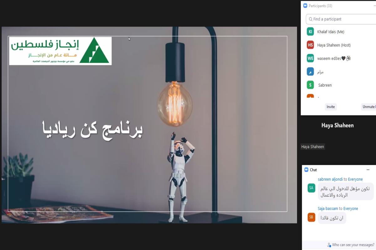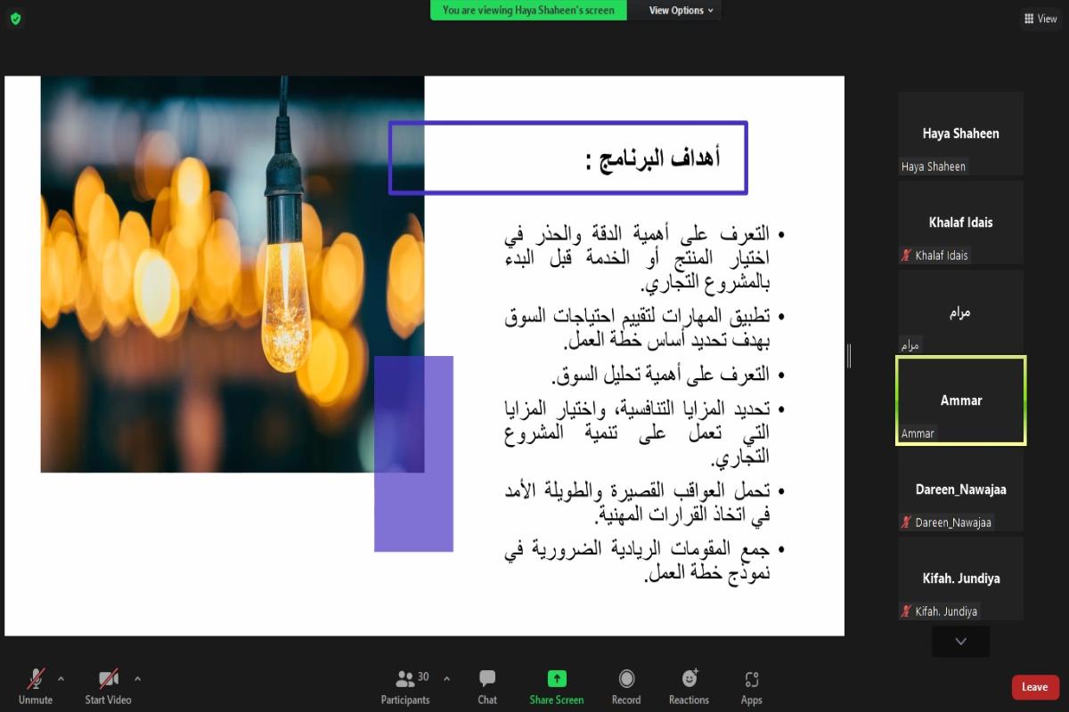 وهدفت الورشة التي عُقدت عبر الصفوف الافتراضية من خلال منصة "زووم"، والتي قدمتها المدربة هيا شاهين من مؤسسة إنجاز فلسطين، إلى تعريف الطلبة على خصائص وممارسات الريادي الناجح، وتقييم الفكرة الريادية بناء على المنتج والزبون ومعايير الميزة التنافسية، إضافة إلى إكساب الطلبة مهارات التسويق والتمويل والإدارة واتخاذ القرارات الأخلاقية المهنية، واستهدفت الورشة (30) طالباً وطالبة من الفرع، الذين أثروا اللقاء بتفاعلهم وأسئلتهم المختلفة.