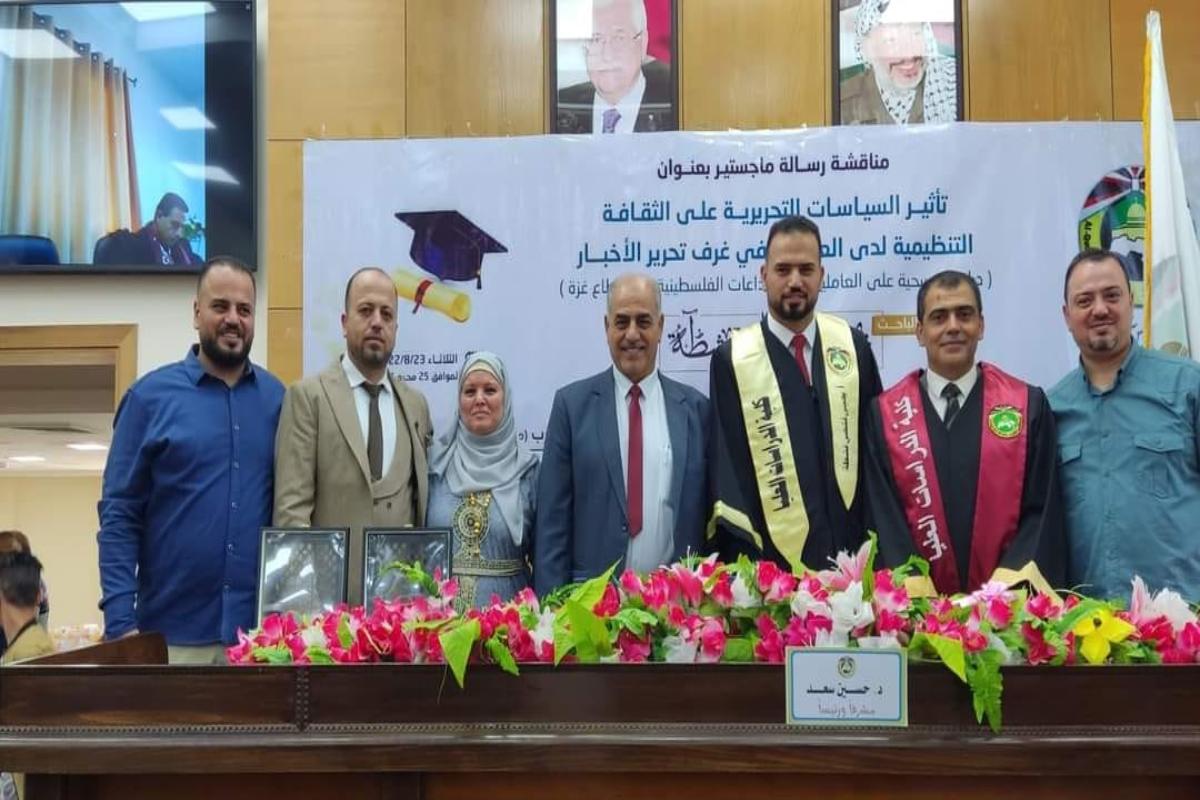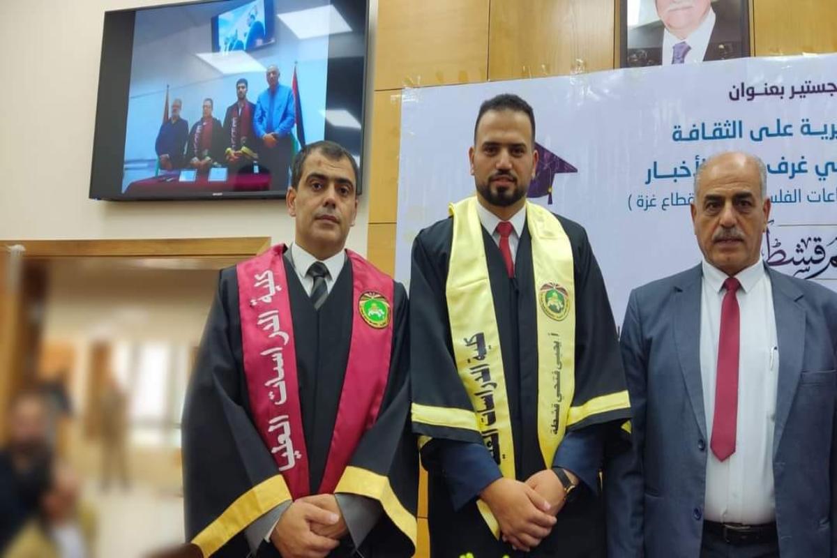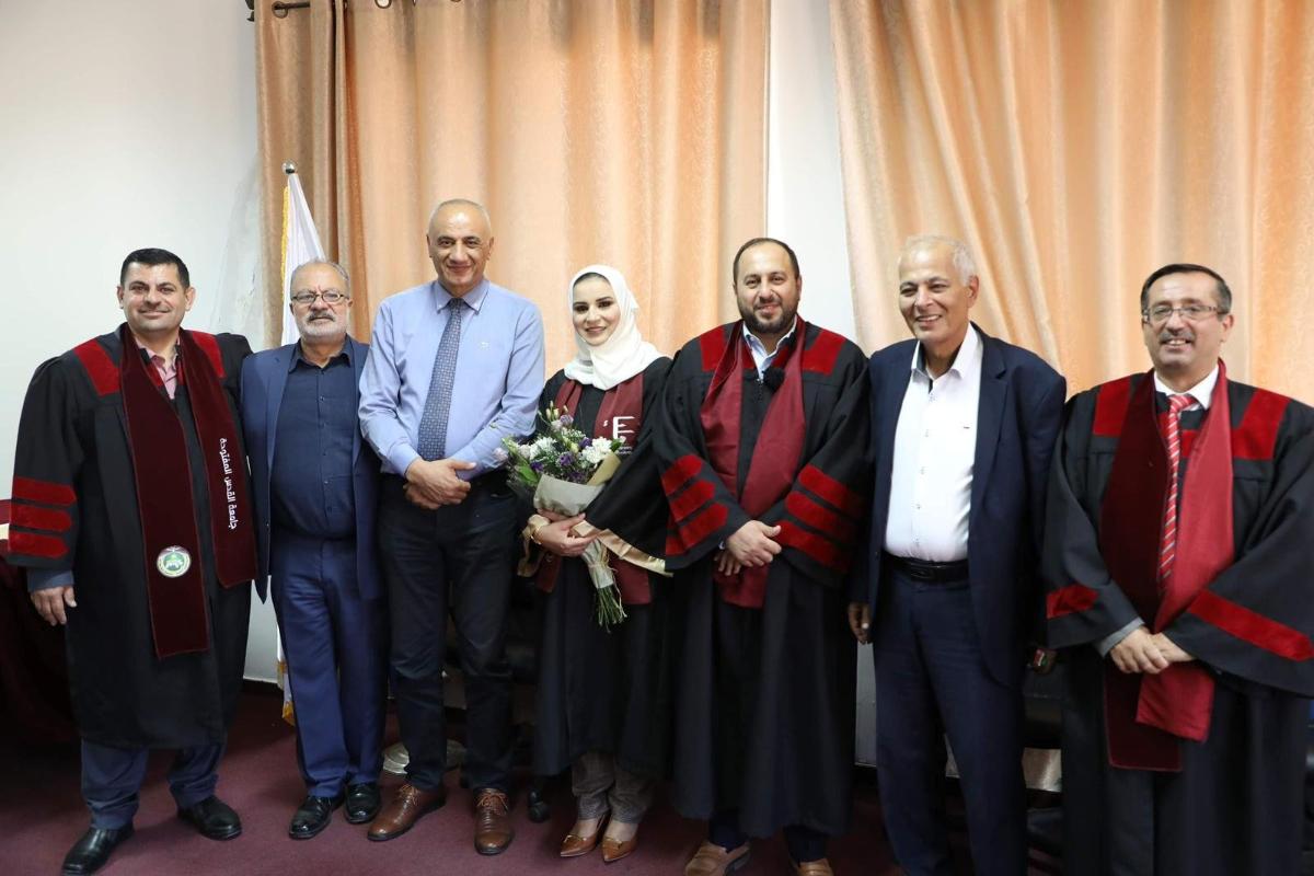 وحضر مناقشة الرسالتين النائب الأكاديمي أ. د. حسني عوض، وعميد الدراسات العليا أ. د. محمد شاهين، وعميد كلية الإعلام د. م. عماد الهودلي، ود. قصي حامد مساعد عميد كلية الإعلام.