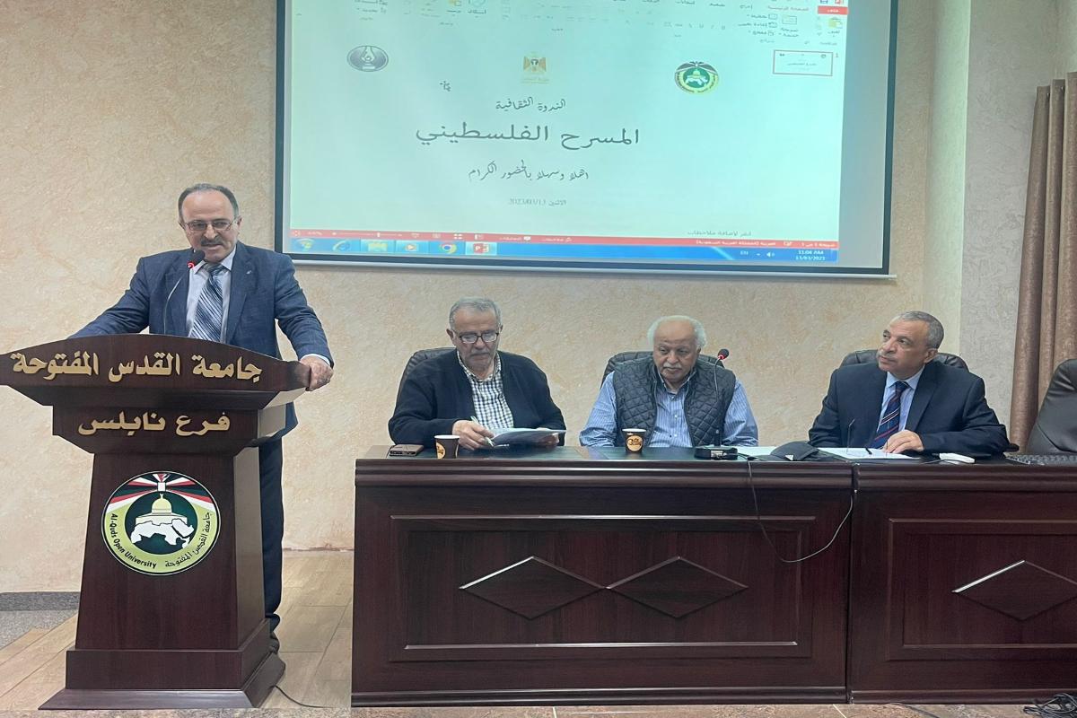 عقد فرع جامعة القدس المفتوحة في نابلس، بالتعاون مع وزارة الثقافة وجمعية المسرح، ندوة بعنوان "المسرح الفلسطيني"، وذلك الإثنين 13-3-2023 في قاعة عزام يعيش في الفرع، بحضور مدير الفرع د. م. عماد نزال، وأعضاء الهيئة التدريسية في قسم اللغة العربية والطلبة المهتمين.