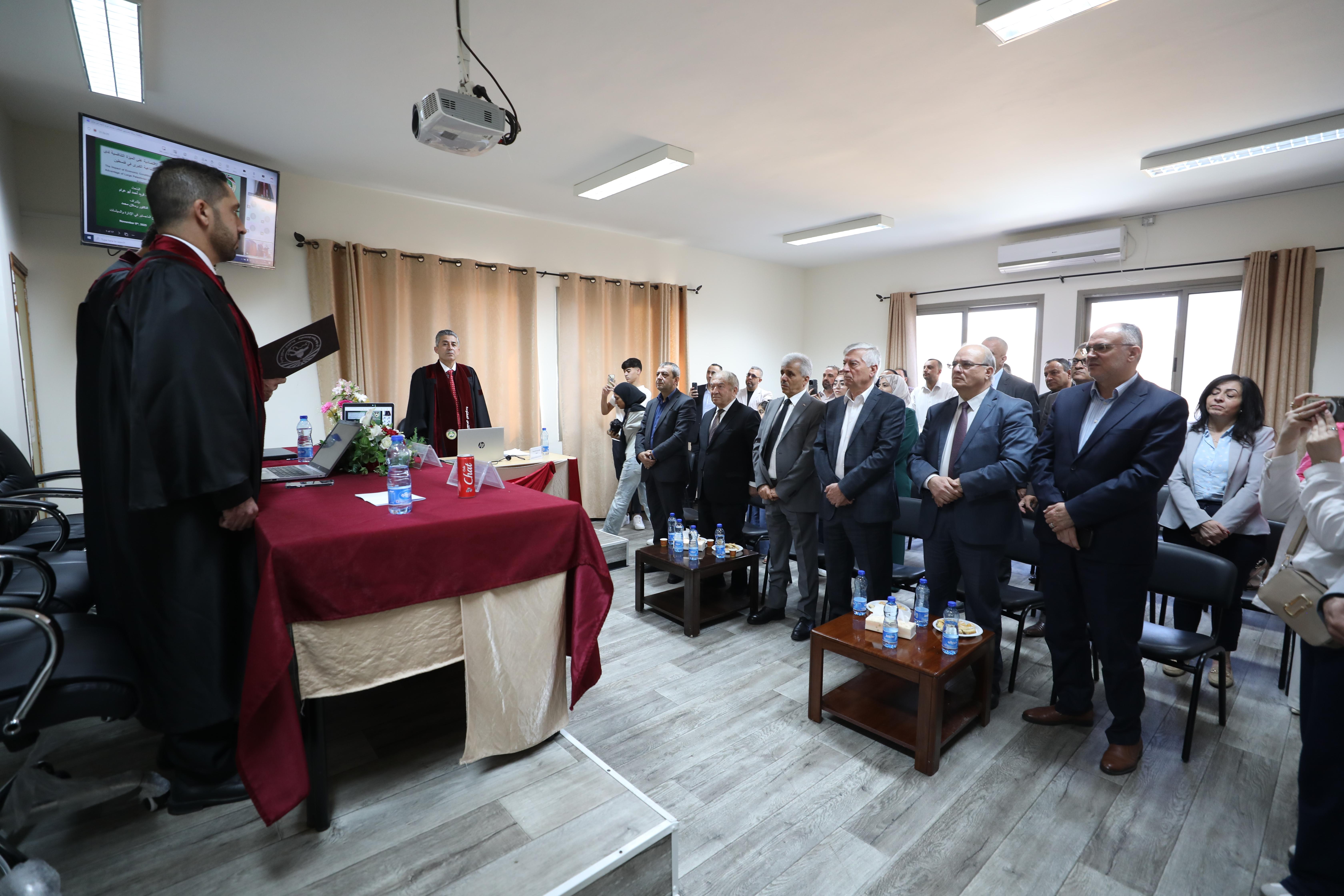 وكانت الجلسة مخصصة لمناقشة رسالة ماجستير للطالب محمد أبو عرام في تخصص الإدارة والسياسات العامة، والتي حملت عنوان: