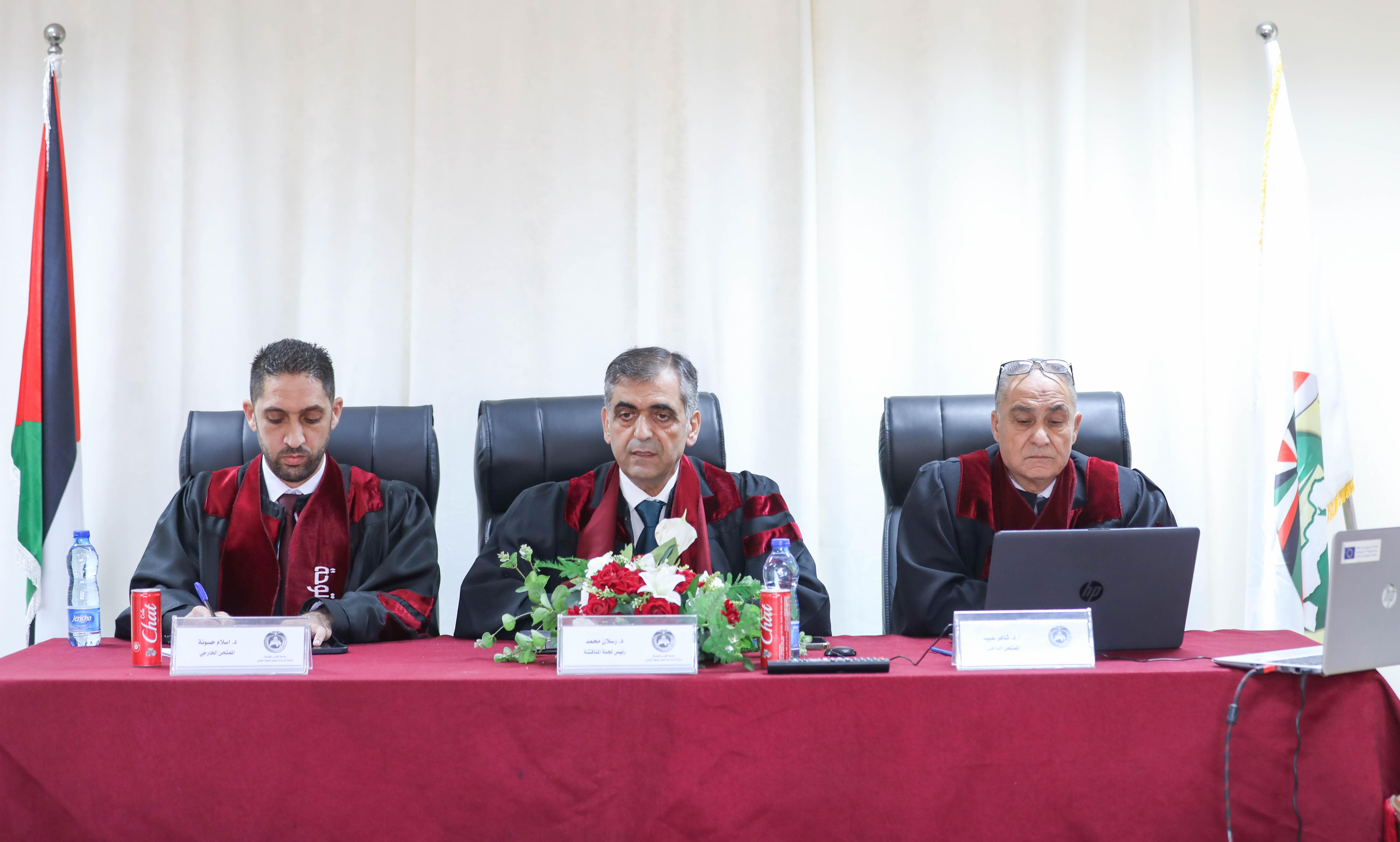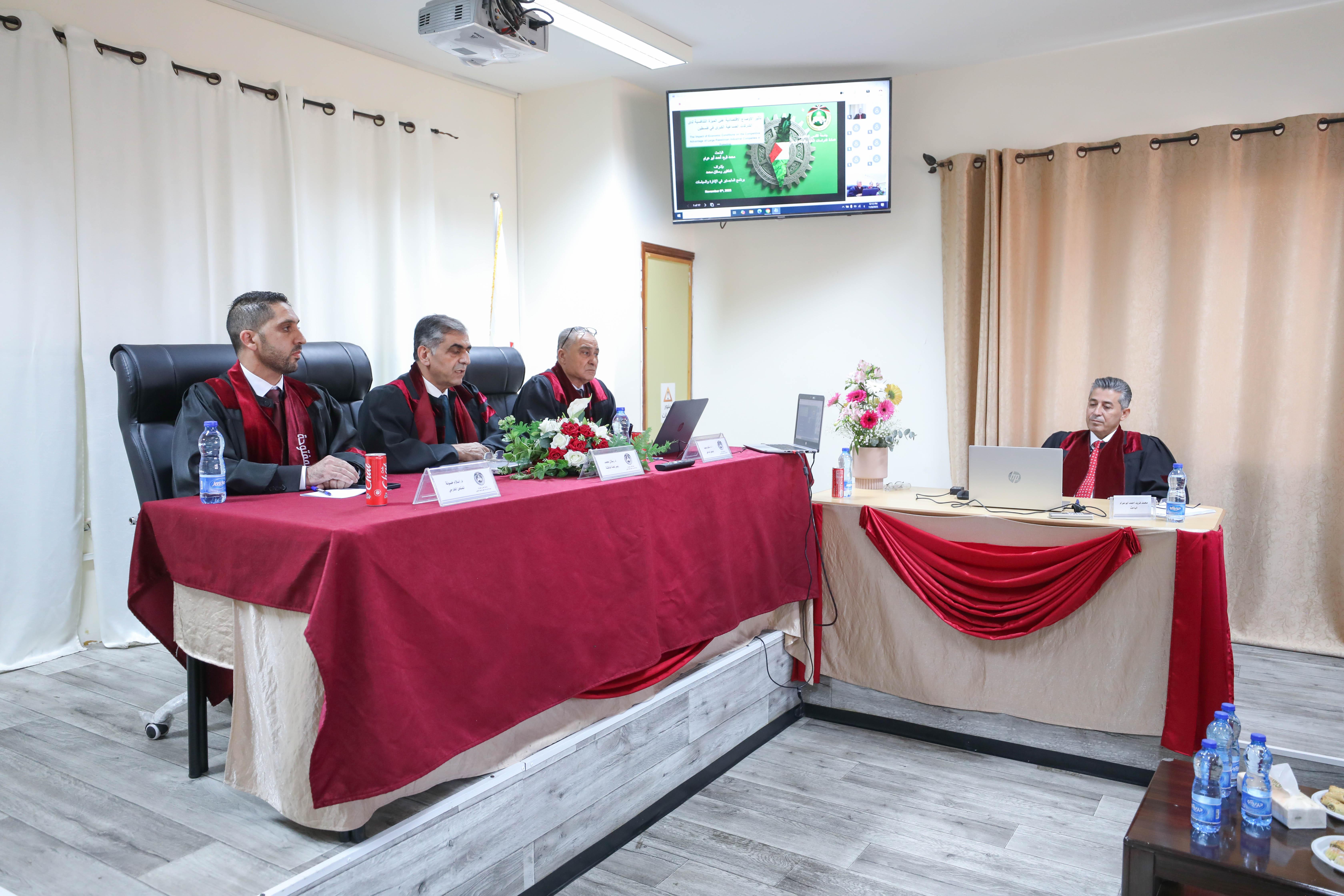 وترأّس لجنة المناقشة د. رسلان محمد مشرفًا ورئيسًا، وعضوية كلٍّ من د. إسلام حسونة ممتحنًا خارجيًا، وأ. د. شاهر عبيد ممتحنًا داخليًا.