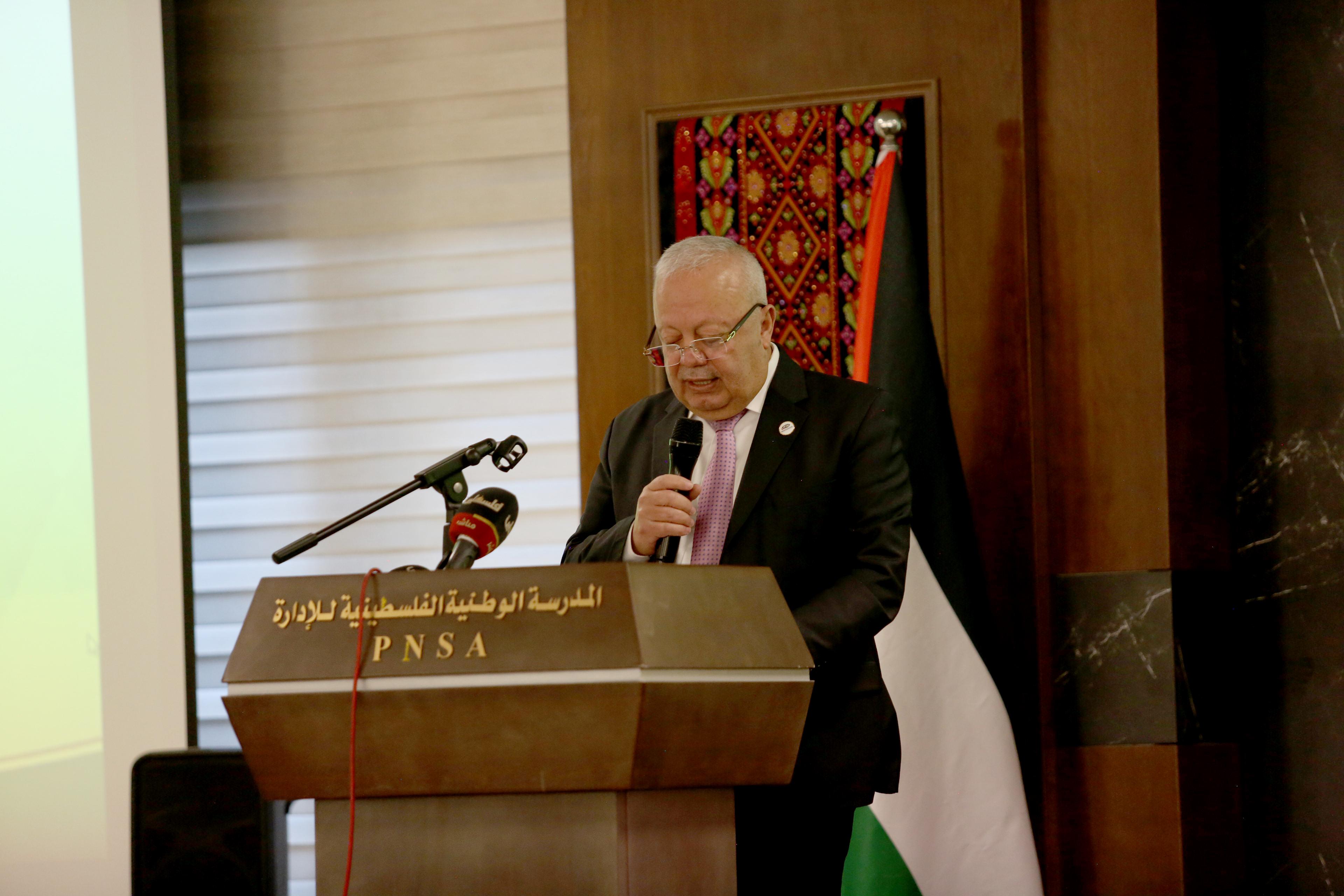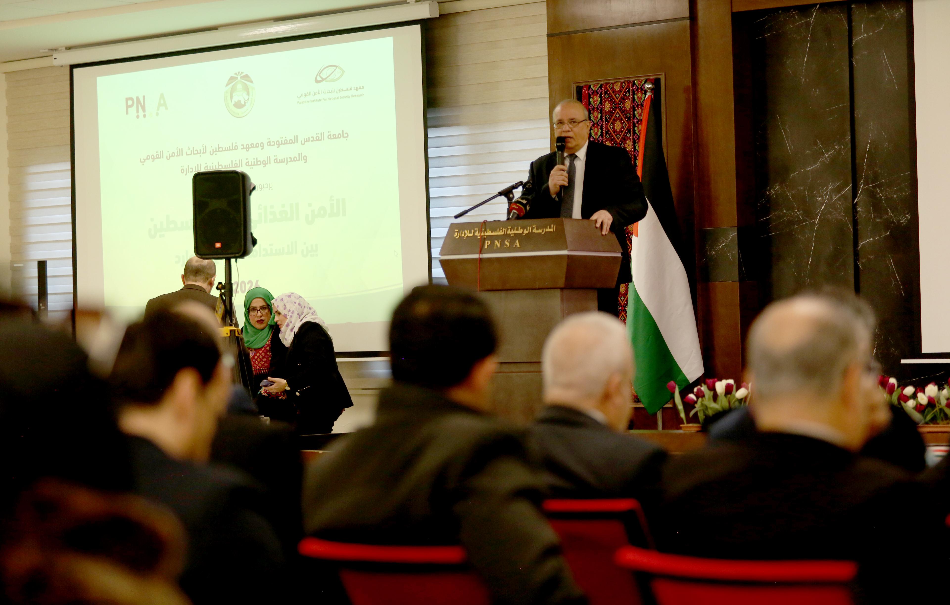 وقال رئيس مجلس إدارة المدرسة الوطنية الفلسطينية للإدارة، الوزير موسى أبو زيد، الذي أكد أن الأمن الغذائي ليس خياراً بل أولوية قصوى ويجب أن يكون على رأس أولويات أجندة الحكومة والقطاع الخاص. وأضاف أن فلسطين تواجه سياقاً وطنياً بالغ التعقيد، حيث تتقاطع الأزمات السياسية والاقتصادية والبيئية، ما يضع الأمن الغذائي في صدارة معادلة الصمود الوطني، مشيراً إلى أن الأمن الغذائي قضية أمن قومي بامتياز لأنها ترتبط مباشرة بالأرض والمياه والإنسان والقرار السيادي.